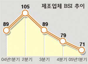 지난 2·4분기(BSI 105) 때 잠깐 반등세를 보인 것을 빼면 2003년 1·4분기 이후 기준치 100을 넘지 못하고 있다. 특히 올 4·4분기 실적 BSI도 64를 기록,2002년 4·4분기 이후 9분기 연속 기준치를 밑돈 것으로 조사됐다.