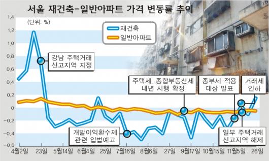하지만 바닥권 탈출 예측은 아직 무리다. 일부 단지의 가격 상승은 개발이익환수제의 도입 지연 기대감에 따른 반사적 현상이란 지적이 많다. 내년부터 재건축아파트에 대한 규제가 시작되면 가격은 하향 안정세로 돌아설 것이란 분석이다. 다만 개발이익환수제의 적용을 받지 않는 일부 재건축 아파트는 가격 상승이 지속될 것으로 보인다.