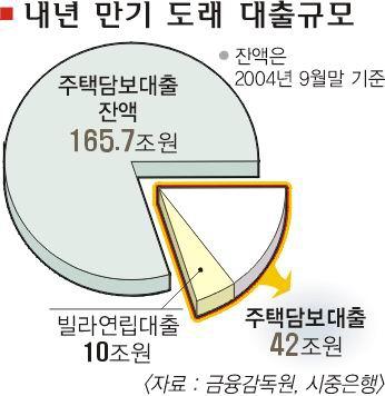 5일 금융계에 따르면 은행들은 서민층의 주요 거주지인 빌라·연립주택을 담보로 2∼3년 전 집중적으로 대출을 해줬다. 대출액 가운데 내년에 만기가 돌아오는 규모는 내년 전체 주택담보대출 만기도래액(42조원 추정)의 25% 수준인 10조원대에 이른다. 당시 은행들은 서민들의 주거안정 지원과 대출처 확대 경쟁 여파로 아파트에 비해 서민들이 상대적으로 많이 구입한 빌라·연립주택에 대해 담보가격 대비 최고 90%까지 대출을 해줬다. 그러나 채무자 대부분은 신용도가 낮은 서민들인 데다, 빌라·연립주택의 주택담보 인정비율도 40%대로 뚝 떨어졌기 때문에 대출금 회수에 나설 경우, 대규모 신용불량자 양산은 불을 보듯 뻔하다는 게 금융계의 시각이다.