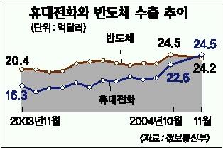 7일 정보통신부가 잠정 집계한 ‘11월 IT 수출·입 실적’에 따르면 휴대전화는 지난달 처음 수출 수위였던 반도체를 추월, 최대 수출품목으로 자리잡았다. 산업자원부의 집계는 나오지 않았지만 최대 수출품목인 반도체를 제쳐 전체 수출 1위가 확실시된다.