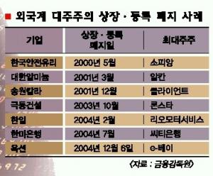외국계 기업의 이같은 상장·등록폐지는 지난해까지 모토롤라의 어필텔레콤 인수, 롱프라우의 전진산업 인수, 타이코인터내셔널의 캡스 인수 등 1년에 1∼2건 정도 발생했다. 그러나 올들어서는 거래소에서 씨티은행의 한미은행 인수와 코스닥에서 리오모터서비스의 한일 인수, 옥션 등 이미 3건이나 발생했다. 연내 2∼3건이 더 진행될 것으로 보인다.