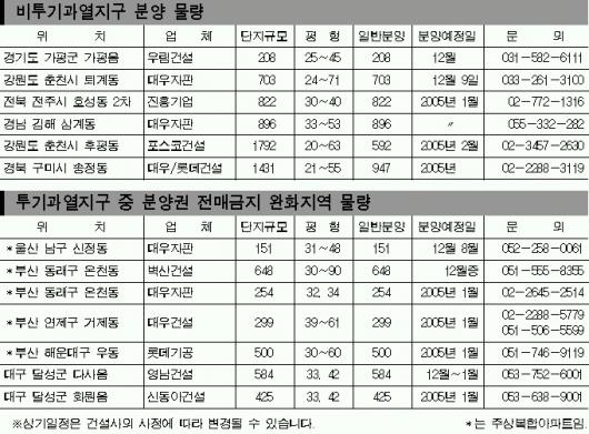 분양권 전매가 가능한 지역에 아파트 분양이 봇물을 이루고 있다. 이들 지역에서는 연말까지 모두 8713가구가 분양된다. 비(非)투기과열지구 물량이 5852가구, 부산 등 투기과열지구이지만 전매 완화지역의 물량이 2861가구이다.