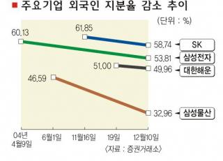 이에 따라 올들어 외국인 지분의 급상승으로 적대적 인수합병(M&A)까지 우려됐던 일부 대기업들의 외국인 지분이 적지 않게 감소했다. 삼성전자의 외국인 지분율은 지난 4월9일 60.13%까지 치솟았다가 지난 10일에는 53.81%로 6.32%포인트 떨어졌다. 외국인들은 삼성전자의 최대주주인 삼성생명 지분(7.0%)에 버금가는 물량을 팔아치운 셈이다.