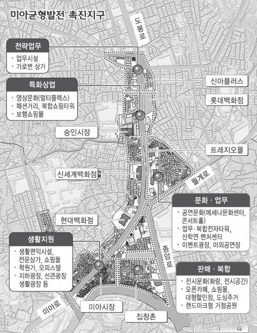 미아사거리 일대에는 도봉·미아로의 랜드마크가 될 수 있는 대형 빌딩을 세울 계획이다. 또 LG아트센터처럼 기업이 지원하는 메세나 문화센터와 야외공연장, 백화점과 연계한 문화센터 등을 각각 유치한다. 길음역 일대에는 ‘길음 뉴타운’과의 접근성을 높이기 위해 길음역 사거리에 지하광장이 조성되고, 학원가, 오피스텔 등이 중심축을 이루는 상업·업무 중심지로 바뀐다. 종암사거리 일대는 집창촌 정비를 통해 거점공원과 화랑 등 전시 문화시설을 조성할 계획이다.