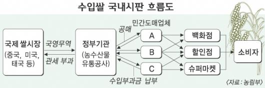 외국쌀은 농수산물유통공사 등을 통해 국영무역방식으로 국내에 들여오게 된다. 이어 민간유통업체 등이 참여하는 공매를 거쳐 원산지를 표시한 뒤 소비자들에게 판매된다.