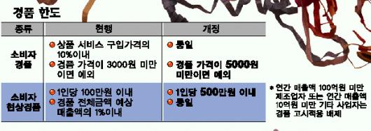 정부는 또 ‘소비자 경품’ 한도 적용을 받지 않는 경품가격도 상향 조정키로 했다. 경품류 가격이 5000원 미만이면 소비자가 구입한 상품·서비스가격의 10%를 초과해도 부당행위로 보지 않기로 했다. 지금은 3000원 미만으로 규제하고 있다.