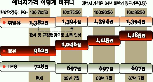 올 하반기 평균가격을 기준으로 경유는 내년 7월 1046원(올해대비 8.7% 상승),2006년 7월 1115원(15.9%),2007년 7월 1185원(23.2%)으로 빠르게 상승한다.LPG는 내년 7월 697원으로 올해보다 4.3% 인하되며 그 이후에는 가격변동이 없게 된다. 휘발유 가격에는 거의 변함이 없다.
