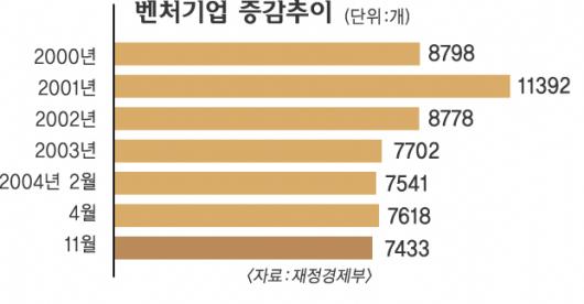 정부는 벤처업계의 규모는 축소되고 있지만 내실은 탄탄해지고 있다고 판단하고 있다. 현재 벤처기업이 우리나라 국내총생산(GDP)에서 차지하는 비중은 고작 3%. 총수출 비중은 4%, 전체 고용 비중은 3%에 그친다. 벤처기업 수는 2001년 1만 1392개를 정점으로 2002년 9106개, 지난해 7702개, 올해 11월 말 7433개 등으로 줄어들고 있다. 그러나 최근 경영의 질은 호전되고 있다. 지난해 매출액 증가율이 25.3%로 중소기업 5.4%, 대기업 6.6%를 크게 능가했고, 매출액영업이익률이나 수출증가율도 우수한 편이다.
