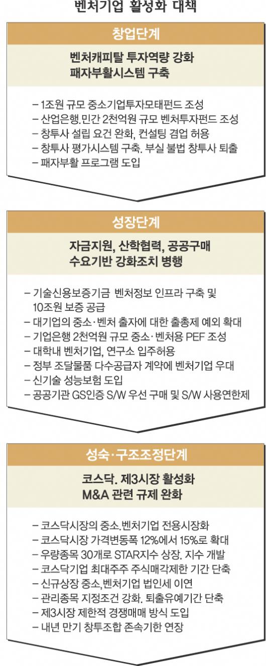 정부는 ▲자금흐름 원활화 ▲대·중소기업 납품체계 확립 ▲연구개발(R&D) 등 벤처 생태계를 구성하는 3대 항목 가운데 자금흐름 활성화에 초점을 맞췄다. 이번 대책을 통해 공급하기로 한 자금규모는 총 11조 9000억원에 달한다. 이번 대책은 창업단계-성장단계-성숙·구조조정단계 등 3단계에 걸쳐 마련됐다. 창업 활성화를 위해 1조원 규모의 중소기업투자모태조합이 만들어진다. 창업·지방·바이오 등 민간투자가 취약한 분야가 대상이다. 창업투자조합 설립과 운영에 관한 규제도 완화돼 납입자본금 요건(최소 100억원), 전문인력 확보요건(최소 3인) 등이 완화된다.