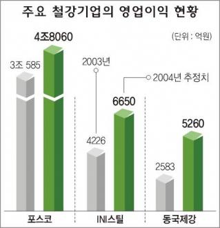 ‘맏형’ 포스코는 지난 3·4분기의 순이익이 1조 120억원을 기록, 삼성전자와 한전에 이어 분기 순이익 ‘1조원 시대’를 열었다. 특히 포스코는 분기실적을 발표할 때마다 목표치를 수정하는 유례없는 호황을 구가했다.
