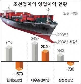 현대중공업은 3·4분기 영업이익이 904억원의 적자로 돌아섰고, 순이익도 330억원의 적자를 기록했다. 삼성중공업도 3·4분기 영업이익이 414억원의 적자를 기록했다.