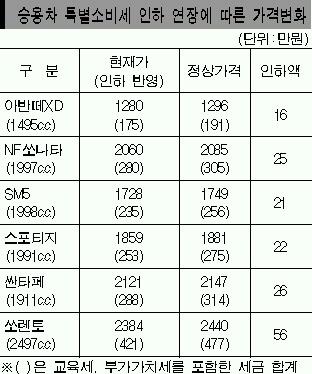 NF쏘나타(1997㏄)의 경우, 특소세 인하가 연장되지 않았다면 내년 1월1일부터는 가격이 2085만원(특소세 305만원)이 되지만 이번 조치로 지금과 같은 2060만원(〃280만원)이 유지된다. 승용차별 특소세 절감액은 ▲쏘렌토 2497㏄ 56만원 ▲아반떼XD 1495㏄ 16만원 ▲SM5 1998㏄ 21만원 ▲스포티지 1991㏄ 22만원 ▲싼타페 1991㏄ 26만원 등이다.