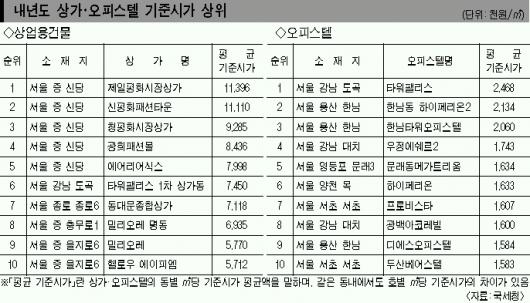 고시 대상 대형상가는 2536동(23만 2967호), 오피스텔은 1610동(17만 4706호)으로 대상 요건에는 해당되더라도 등기부상 호별로 구분등기가 돼 있지 않거나 공실률이 50% 이상인 경우는 제외됐다. 상업용 건물 가운데 동별 평균 기준시가가 가장 높은 곳은 중구 신당동 제일평화시장 상가로 ㎡당 1139만 6000원이었고 오피스텔중 최고 기준시가는 강남구 도곡동 타워팰리스(㎡당 246만 8000원)였다. 상가·오피스텔 기준시가는 영업상 기밀 공개의 부작용을 막기 위해 호별 가액이 아니라 ㎡당 가액으로 고시되는 만큼 호별 기준시가를 알려면 건축물 대장상 전유·공용 면적을 확인해 직접 계산해야 한다.
