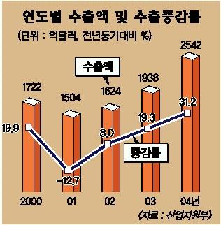 우리나라의 지난해 연간 수출액이 2542억달러로 사상 최대 실적을 기록했다. 2일 산업자원부가 발표한 2004년 수출·입 실적에 따르면 수출액은 2542억 2000만달러, 수입액은 2244억 7000만달러로 전년보다 각각 31.2%와 25.5% 증가한 것으로 잠정 집계됐다.
