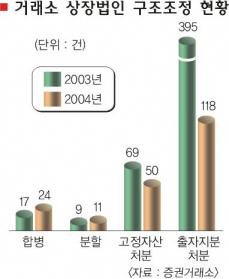 이런 현상은 코스닥 기업들도 마찬가지다. 지난해 코스닥 등록기업의 합병은 2003년보다 5건 늘어난 22건, 분할은 1건 늘어난 11건이었다.