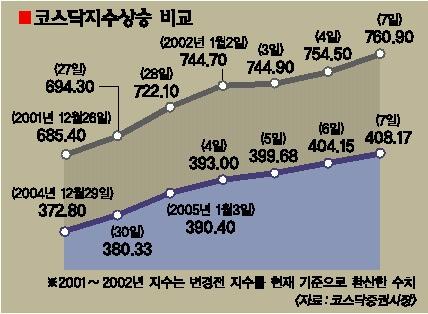 7일 코스닥지수는 전날보다 4.02포인트 상승한 408.17을 기록했다. 오후 한때 주가지수가 409선을 넘자 개인투자자를 중심으로 매물이 쏟아지면서 하락세를 나타냈으나 기관과 외국인 투자자들이 뒤를 받쳐 주면서 상승세를 이어갔다. 이날 거래대금은 1조 3696억원. 지난해에는 하루 평균 5861억원에 불과했던 거래대금이 지난 5일에 1조 128억원,6일엔 1조 5248억원 등으로 3일째 1조원선을 넘었다. 지난해에는 1조원을 넘은 때가 단 3일뿐이었던 것과 비교하면 ‘코스닥 부활’로 보는 시각도 무리는 아닌 셈이다. 코스닥은 7개월간 저항선으로 작용한 지수 380선을 힘겹게 뚫은 뒤 지난 6일 400선(404.15)을 7개월여만에 돌파했다. 최근의 상승세는 2001년 12월26일(685.40)부터 2002년 1월7일(760.90)까지의 상승세를 닮았다.