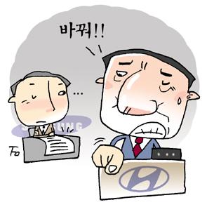 ●현대차 ‘쾌도난마형’ 아무리 요직 임원이어도 문제가 있다 싶으면 사내 여론이나 언론 눈치를 살피지 않고 곧바로 교체한다. 현대차 북경법인 대표·기아차 국내영업본부장·기아차 광주공장장 등 내로라하는 부사장급 임원들을 몇달만에 갈아치운 예가 대표적이다. 거꾸로 잘한 일이 있으면 정기인사 때까지 기다리지 않고 승진도 바로 시킨다. 현대그룹 특유의 공격적이고 저돌적인 면모다. 다른 그룹에 비해 인사에 미치는 그룹회장(정몽구)의 영향력이 매우 세다. 언제 어느때 허를 잘릴지 모르는 이같은 인사 스타일은 조직에 긴장감을 불어넣는다. 때론 지나치게 예측 불허여서 불안감을 조성하기도 한다.