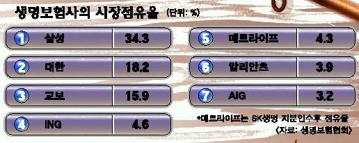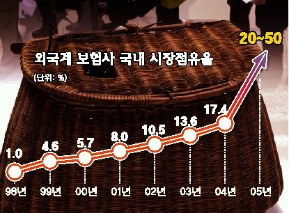 외국계 보험사의 생보시장 점유율은 지난해 말 기준으로 17.4%에 이른다. 지난 1998년에는 1%에 불과했으나 해마다 30% 이상씩 신장되면서 올해는 30%에 육박할 것으로 예상된다. 한 외국계 최고경영인(CEO)은 신년사에서 “한국은 미국을 제외한 세계 3대 보험시장”이라면서 “1∼2년안에 한국시장의 50%를 외국계 보험사들이 확보할 수 있다.”고 말한 것으로 알려졌다.