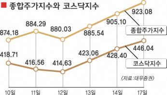 17일 거래소시장에서 지수는 지난주말의 기세를 몰아 전날보다 10.12포인트 뛴 915.22로 출발한 뒤 상승 폭을 키워 17.98포인트(1.99%) 오른 923.08로 마감했다.