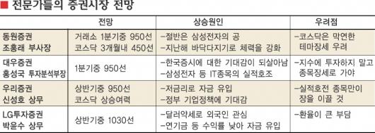 거래소와 코스닥 증권시장에서 상승세를 이끄는 종목은 공통적으로 IT종목이다. 증시에선 우리나라 5대 수출품 가운데 반도체, 휴대전화,LCD모니터 등 3개 부문을 석권하고 있는 삼성전자가 올해 설비투자 규모를 지난해보다 33%(10조 3000억원) 늘림에 따라 실적에 대한 낙관론이 폭넓게 번지고 있다. 코스닥에선 정부의 벤처육성정책이 곧 가시화될 것이라는 기대감이 최고조에 달했다. 올 상반기중 종합주가지수는 950∼1150선, 코스닥지수는 450선을 돌파할 것이라는 데 별다른 이견이 없다.