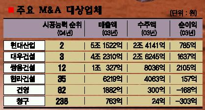 매각 절차를 밟을 것으로 예상되는 굵직굵직한 업체는 현대·대우·쌍용·청구 등이다. 외환위기 이후 나름대로 뼈를 깎는 노력으로 회사가 정상화의 길을 걷고 있다. 수주·매출이 증가하고 당기 순이익을 내는 등 재무 상태도 개선됐다. 하지만 채권단에 넘어간 이상 채권회수를 위해 공개 매각 절차를 피할 수 없을 것으로 보인다.