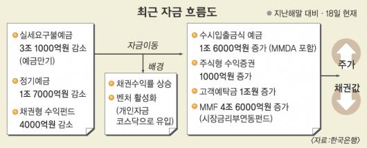 한은에 따르면 지난해말 대비 지난 18일 현재 실세요구불예금은 무려 3조 1000억원가량 감소했다. 지난 연말 만기가 돌아온 예금을 고객이 대거 빼내간 것이다. 정기예금도 1조 7000억원, 채권형 수익펀드도 4000억원가량 빠져나갔다. 반면 수시입출금식 예금(1조 6000억원), 고객예탁금(1조원), 시장금리부연동펀드(MMF·4조 6000억원) 등은 크게 늘었다. 특히 MMF의 폭발적인 증가는 지난 연말 기업들이 부채상환용으로 자금을 일시 빼내갔다가 올들어 다시 넣은 것을 감안하더라도 작지 않은 규모다. 수치로만 보면 올들어 불과 3주 만에 예금은행과 채권시장에서 주식시장으로 빠져나갔거나 대기중인 자금이 모두 7조 2000억원가량 된다는 얘기다. 현재 시중의 부동자금은 6개월 이내의 단기예금(150조원)을 포함해 400조원가량 되는 것으로 파악된다.