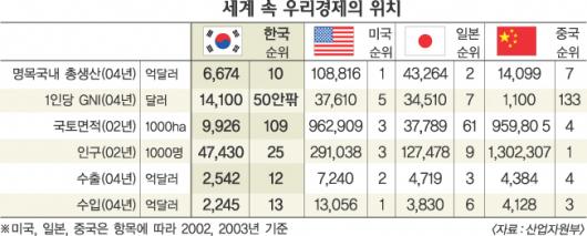국내총생산(GDP) 규모 기준으로 우리나라 경제가 세계 10위권에 진입했다.2003년까지만 해도 11위였지만 지난해 멕시코를 앞질렀다. 또 2008년이면 1인당 국민소득이 2만달러를 돌파할 것으로 예상됐다.