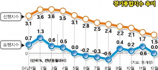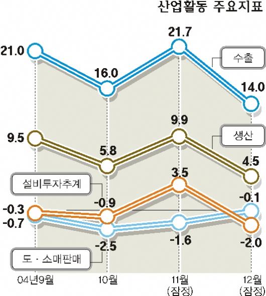 휴대전화 등 영상음향통신기기 수출 감소, 반도체 생산 증가율 둔화 등이 원인이다. 한달 전인 작년 11월 반짝 증가세를 보였던 설비투자(추계)도 전년 같은 달보다 2.0% 줄어 다시 하락세로 돌아섰다. 도소매 판매는 자동차 및 차량연료 판매(4.6%)는 늘었지만 도매업(-0.6%), 백화점(-4.9%)을 포함한 소매업(-1.1%) 판매가 줄면서 마이너스 0.1%를 기록했다.6개월 연속 감소세다.