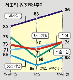 한국은행이 2463개 기업을 조사해 31일 발표한 ‘2005년 1월 기업경기조사 결과’에 따르면 제조업 업황실사지수(BSI)는 74로, 지난해 12월의 71에 비해 3포인트 상승했다. 지난해 6월(78) 이후 7개월만에 가장 높은 수치다. 대기업 업황BSI는 83에서 86으로, 중소기업도 65에서 68로 높아졌다. 수출기업 업황BSI는 68에서 74로 올라 한달만에 반전됐다. 내수기업도 72에서 74로 상승했다.