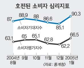 재경부는 특히 이날 통계청이 발표한 소비자전망(대표적인 소비심리 지표)에 고무된 반응을 보였다. 실제로 이 결과는 소득과 연령별로 기대지수가 모두 상승했음을 보여줬다. 특히 20대의 기대지수가 3개월 연속 상승세를 타며 103.3을 기록, 지난해 5월 이후 8개월 만에 기준치를 넘어섰다.2003년 1월(103.4) 이후 최고치다. 또 월 소득 400만원 이상 고소득층의 기대지수가 2개월 연속으로 상승하며 기준치에 근접한 99.0을 기록했다.300만∼399만원(93.7),200만∼299만원(91.6),100만∼199만원(87.1),100만원 미만(82.3) 등 중산층과 저소득층의 기대지수도 모두 상승했다.