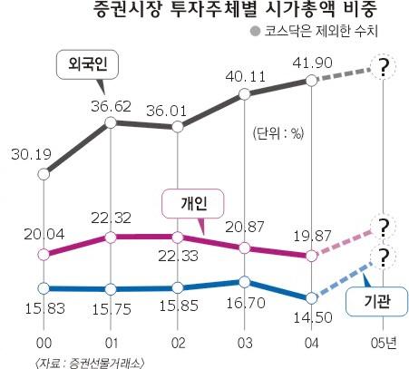 외국자본이 국내 증권시장(코스닥 제외)에서 차지하는 비중은 해마다 높아지면서 지난해말 41.90%를 기록했다. 국내 개인(19.70%)과 기관(14.50%)의 투자비중을 합친 것보다도 높다.