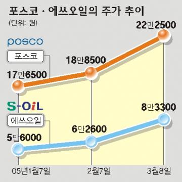 주식시장에서도 연일 상종가로 이어지고 있다. 에쓰오일의 이날 종가는 8만 3300원으로 지난 1월3일(6만 5000원)보다 28%가량 뛰었다.SK㈜도 6만 2900원을 기록, 지난 1월3일(5만 5600원)보다 13% 올랐다.