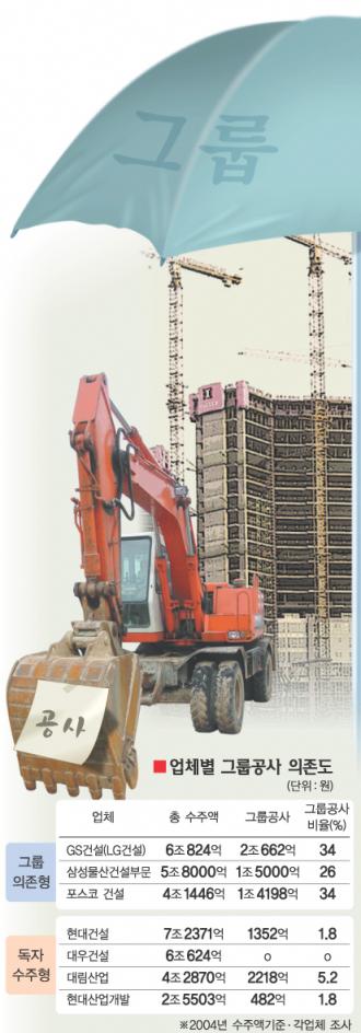 주요 건설업체들의 지난해 수주 내역을 분석한 결과 ‘그룹 우산’ 아래에 있는 업체들은 ‘앉아서’ 연간 수천억 내지 수조원 규모의 그룹 공사로 몸집을 키우고 있다. 그룹 공사는 경쟁을 치르지 않고 수익성도 높아 유동성 자금 확보 등에 긍정적인 측면이 있으나, 자칫 온실 속에 갇혀 수주 경쟁력이 떨어질 수 있다는 지적도 나오고 있다.