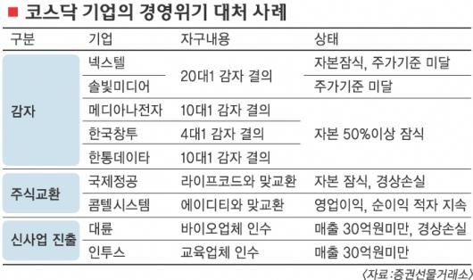 일부 업체는 자본금을 줄여 주가상승을 노리는 감자(減資)를 선택하고 있다. 교육소프웨어업체 솔빛미디어는 주가가 지난 1월27일부터 30일 이상 액면가의 40%(200원)를 밑돌아 관리종목으로 지정됐다. 지정 이후 90일동안,10일 연속 주가의 부진이 계속되면 상장이 폐지된다. 결국 경영진은 20대 1의 감자를 결정하고 재무구조 개선을 통해 주가상승을 기대하고 있다. 지난 11일 주가 기준 미달과 자본잠식률이 50%를 웃돌아 관리종목에 편입된 넥스텔도 감자를 선택했다.