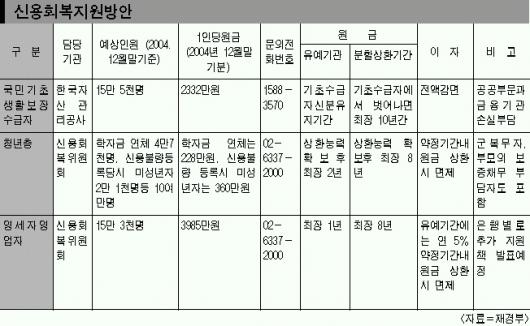 재정경제부는 이런 내용의 ‘생계형 신용불량자 신용회복 지원방안’을 23일 노무현 대통령에게 보고했다. 정부는 “금융기관별로 실행계획이 확정되는 대로 이르면 이달 말부터 순차적으로 지원이 이루어질 것”이라고 밝혔다. 정부는 ▲기초수급자(올해 4인가구 기준 월 소득 114만원 이하) 15만 5000명 ▲영세자영업자(간이과세 사업자 등) 15만 3000명 ▲청년층(학자금 연체자 등) 10여만명 등 40만명을 생계형 신용회복 지원 대상에 포함시켰다.