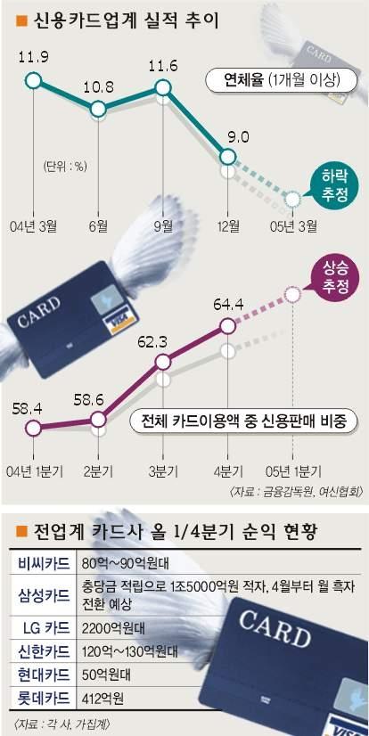 지난 2003년 ‘카드대란’ 이후 엄청난 적자에 허덕여온 신용카드업계가 부활의 날갯짓을 하고 있다. 부실자산을 줄이고 신용판매 위주의 건실한 영업을 강화하면서 연체율이 감소,2년만에 모든 카드사들이 월 기준 흑자 전환을 앞두고 있다. 영업이 안정권에 들어선 만큼 향후 경기회복 여부와 우량고객 위주의 마케팅이 관건이 될 전망이다.