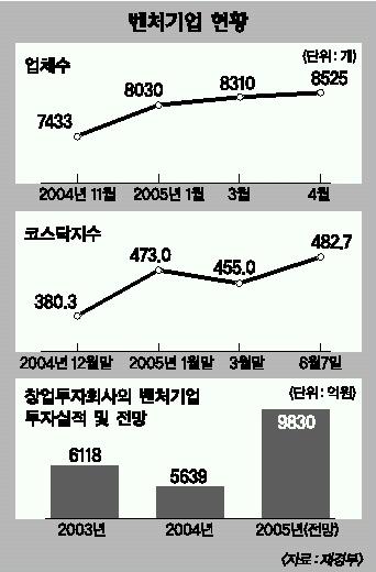 벤처기업에 대한 창업투자회사의 투자실적은 2003년 6118억원에서 2004년 5639억원으로 떨어졌다가 지난해 말 벤처활성화 대책 이후 활성화, 올해에는 9830억원으로 74%나 급증할 것으로 예상된다.