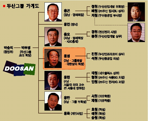 박용오(68) 회장은 건강엔 문제가 없지만 고희를 앞둔 고령이어서 대내외적으로 정력적인 활동을 펼치고 있는 박용성(65) 회장 체제로 개편을 서두른 것으로 알려졌다. 박용성 회장보다 15살 아래 동생인 박용만(50) 부회장이 그룹의 지주회사격인 ㈜두산을 비롯한 6개 상장사의 등기이사직을 꿰차고 있어 향후 박용성 회장-박용만 부회장의 ‘쌍두마차 경영’이 예상된다.