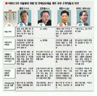 반면 황영기 우리은행장과 리처드 웨커 외환은행장은 “강남, 분당, 용인 등의 아파트 가격은 버블(거품) 위험의 징후가 있다.”고 밝혔다. 최동수 조흥은행장은 “거품에 대한 의구심이 크지만 쉽게 판단할 사항은 아니다.”는 유보적인 입장을 보였다. 이들 3명의 행장은 비록 거품이 붕괴되더라도 주택가격이 폭락하고, 은행이 부실화하지는 않을 것이라고 판단했다.