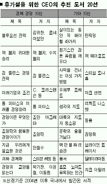 삼성경제연구소는 국내 기업의 최고경영자(CEO) 1600명을 대상으로 설문조사를 한 결과 올 여름에 꼭 읽어야 할 책으로 ‘블루오션 전략’과 ‘살아 있는 동안 꼭 해야 할 49가지’ 등이 선정됐다고 20일 밝혔다.