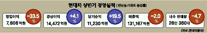 현대차는 28일 서울 여의도 증권거래소에서 이같은 내용의 상반기 경영실적을 발표했다. 장사해서 번 돈인 영업이익은 7806억원으로 전년 동기 대비 33.5% 감소했다.