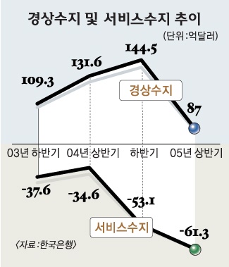 해외여행이 크게 늘면서 서비스수지 적자가 급증한 반면 상품수지 흑자폭은 줄어들어 올해 상반기 중 경상수지 흑자액이 지난해 같은 기간의 3분의2 수준에 불과한 87억달러에 그쳤다.