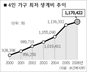 보건복지부는 12일 중앙생활보장위원회 의결을 거쳐 올해 최저생계비(4인가구 기준 113만 6332원)에 물가상승률 등을 감안해 가구 규모별로 평균 4.15%를 인상한 2006년도 최저생계비를 이같이 확정했다고 밝혔다.