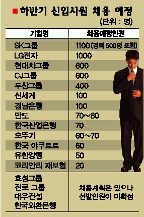 기업별로는 SK그룹이 9월 중 4년제 대졸 정규직 600명을 신규채용할 예정인데, 경력직을 포함한 하반기 총 채용규모는 1100명이다.LG전자는 9월부터 캠퍼스리크루팅과 수시채용을 통해 1000여명의 인력을 충원할 예정이다. 상반기 600명을 선발한 현대차그룹은 하반기에도 600명 이상을 채용할 것으로 예상하고 있다.CJ는 9월 공채 200명, 수시채용 400여명 등 총 600여명의 인력을 하반기에 뽑는다.