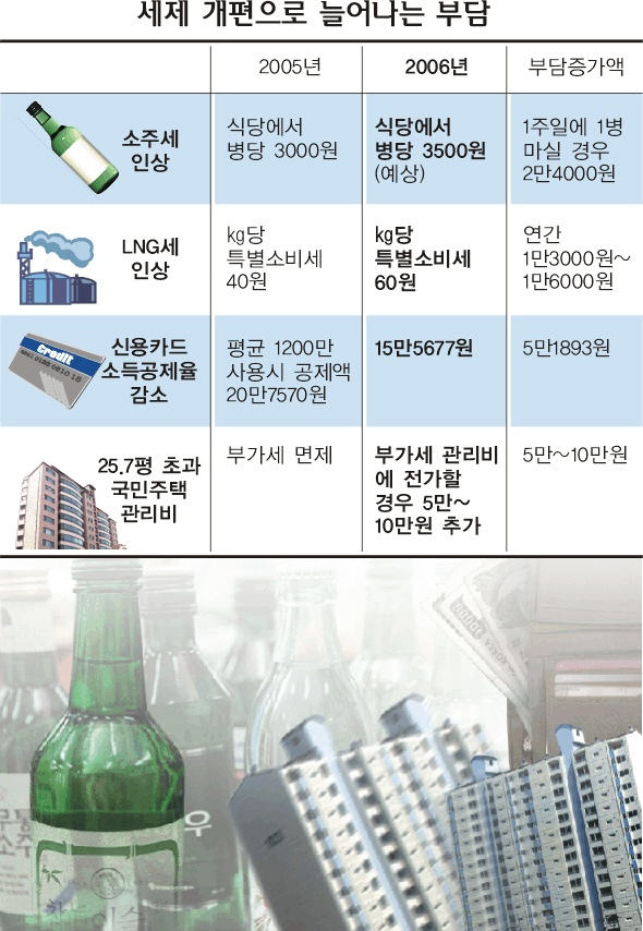 소주세가 인상될 경우 식당에서 받는 소주 1병당 가격은 3000원에서 3500원으로 오를 전망이다. 이 경우 식당에서 1주일에 소주 1병만 마셔도 소비자는 연간 2만 4000원을 추가로 부담하게 된다.1주일에 3병을 마신다면 연간 추가 부담액은 7만 2000원이다. 액화천연가스(LNG)에 붙는 세금을 ㎏당 20원씩 올리면서 농민들이 난방용으로 쓰는 등유에 비해 세율이 낮다는 이유를 댄 것도 설득력이 떨어진다는 지적이다.