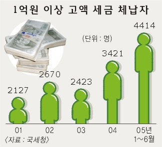 1억원 이상 고액세금 체납자는 지난 6월 말 현재 4414명으로 이미 지난 한해 동안의 고액 체납자수(3421명)를 웃돌았다. 지난 2001년에는 2127명이었으나 2002년에는 2670명으로 뛰었다.2003년에는 2423명이었다.