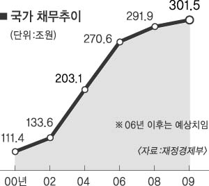 정부는 올해 국가재정법을 제정, 국가채무 관리방안을 마련할 계획이라고 밝혔으나 2009년에는 301조 5000억원으로 10년도 안돼 나라 빚이 3배 가까이 늘어날 전망이다.
