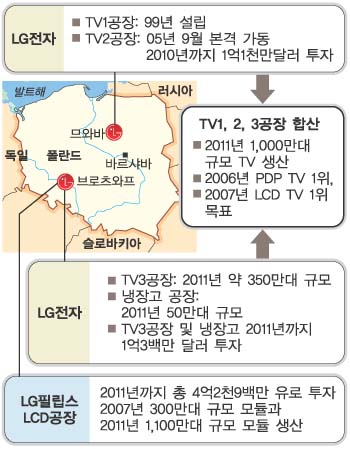 3일 LG에 따르면 LG전자와 LG필립스LCD(LPL)는 2011년까지 폴란드 브로츠와프와 므와바에 순차적으로 총 7억 3000만달러(7500억원)를 투자, 연산 1000만대 규모의 TV와 냉장고 50만대, 액정표시장치(LCD)모듈 1100만대를 생산키로 했다. 이를 통해 내년 PDP TV의 유럽 판매 1위와 2007년 LCD TV 1위를 달성할 방침이다.