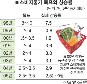 지금까지 실제 소비자물가 상승률이 물가안정 목표치를 벗어난 적은 외환위기가 발생한 이듬해인 98년과 99년 두 차례밖에 없다.98년 목표는 8∼10%였지만 실제 물가상승률은 7.5%였다.99년엔 목표는 2∼4%였지만 실제 물가상승률은 0.8%에 그쳤다.98년과 99년의 물가 목표는 농산물과 석유류 등을 포함한 소비자물가지수를 기준으로 했다.
