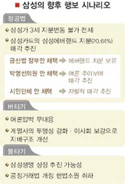 삼성의 지배구조 ‘해법 카드’가 과연 무엇일지 이목이 집중된다. 삼성에버랜드의 지분 매각으로 정공법을 택할 것인지, 여론의 동향을 살피며 최대한 버티기에 나설 것인지, 아니면 여론을 떠보는 ‘외곽 때리기’나 ‘물타기’를 선택할지 삼성의 향후 행보를 시나리오별로 알아본다.